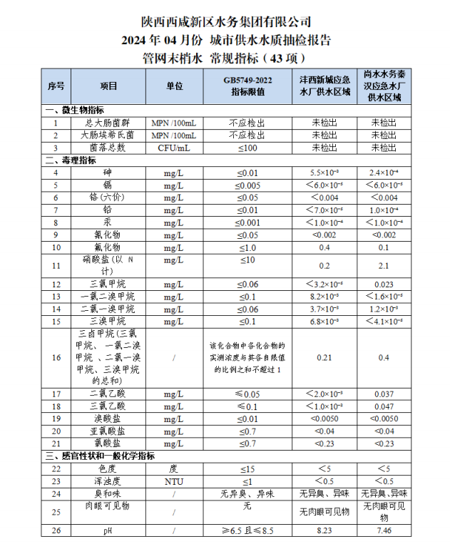 西咸水務水質信息公示報告(2024年4月)